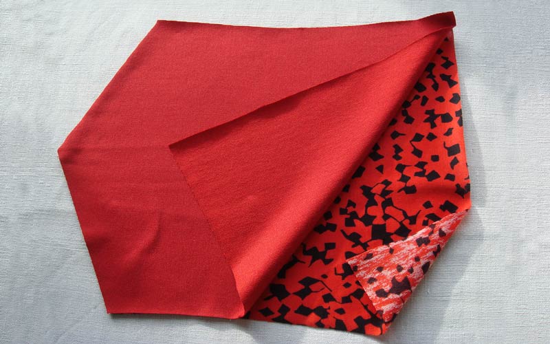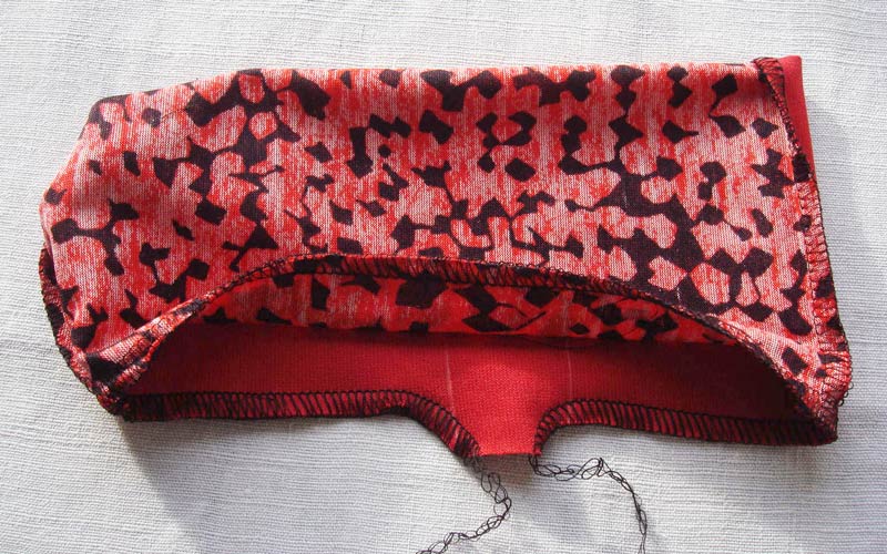 Verstürzen Sie die obere und untere Kante rechts gegen rechts mit der Overlock oder mit einem dehnbaren Zickzackstich der Nähmaschine.