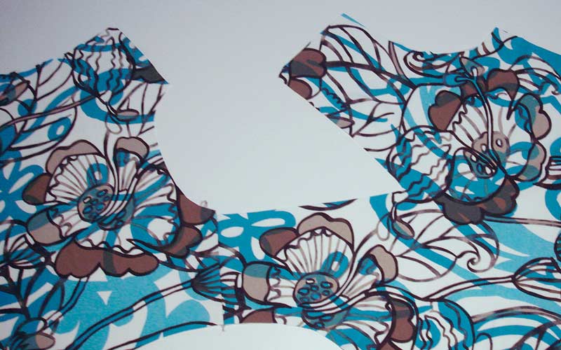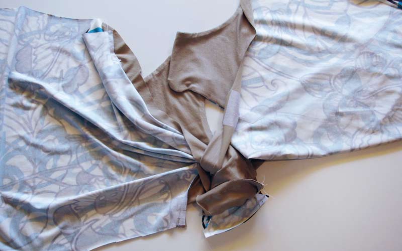 Nach dem Zuschnitt: Bekleben Sie am Shirt und am Besatz das untere Ende des V-Ausschnittes mit einer passenden Einlage, damit später beim Einschneiden keine Fallmaschen entstehen. Nähen Sie alle Nähte mit kleinen Zickzack-Stichen, damit die Nähte elastisch bleiben. Nähen Sie die rechte Schulternaht Ihres Shirts und die rechte Schulternaht des Besatzes. Achten Sie darauf, dass beim Besatz die schöne Seite des Stoffes am Innern des Körpers zu liegen kommt.